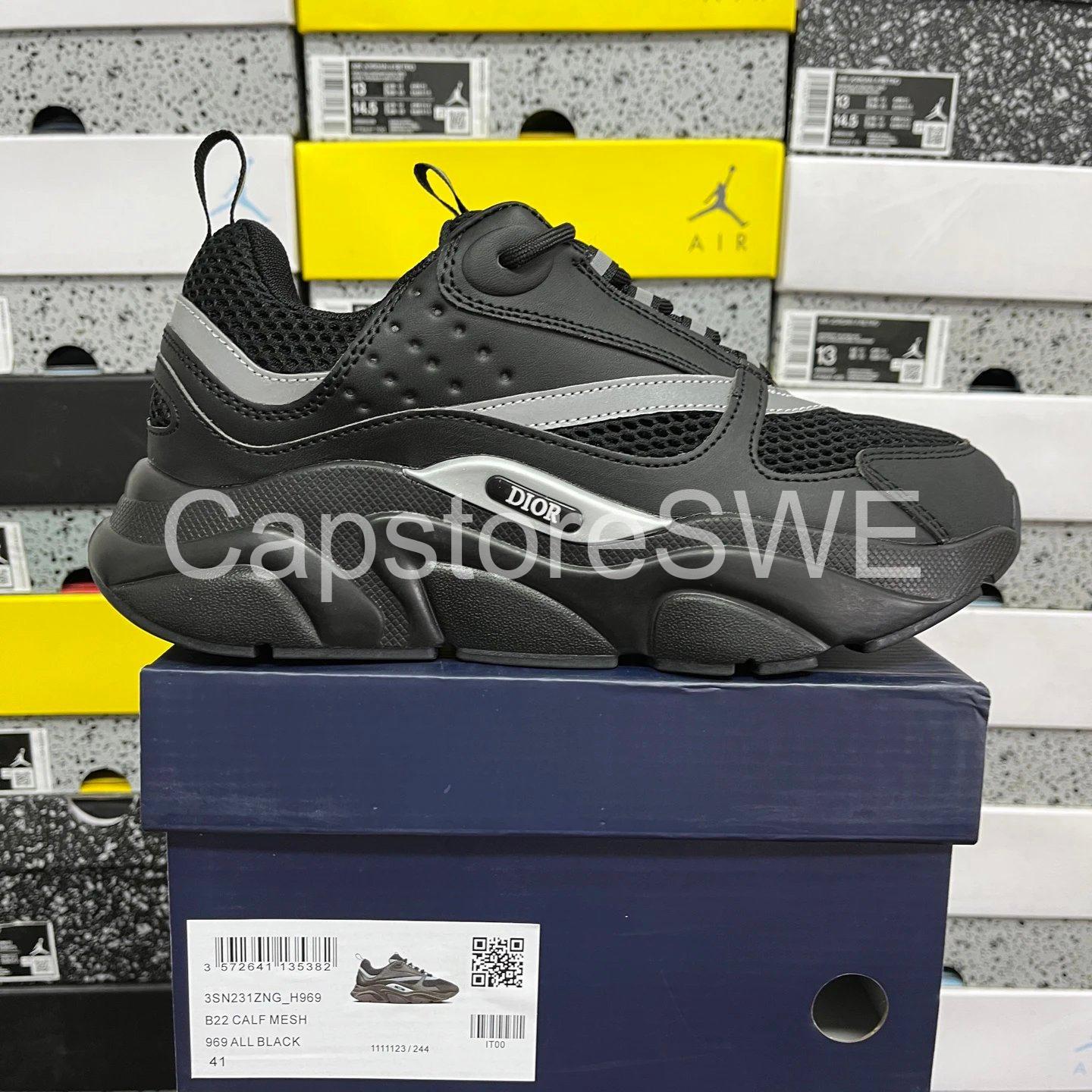 The Dior B22  combine sporty design with luxurious craftsmanship. Constructed from premium calfskin leather and breathable mesh, these sneakers offer exceptional comfort and durability. The dynamic silhouette features a thick sculpted rubber sole for added height and support, while the metallic Dior logo accent adds a refined touch. Perfect for casual and high-fashion outfits alike, the B22 showcases Dior’s signature blend of innovation, comfort, and urban sophistication — an essential piece for the modern sneaker enthusiast.