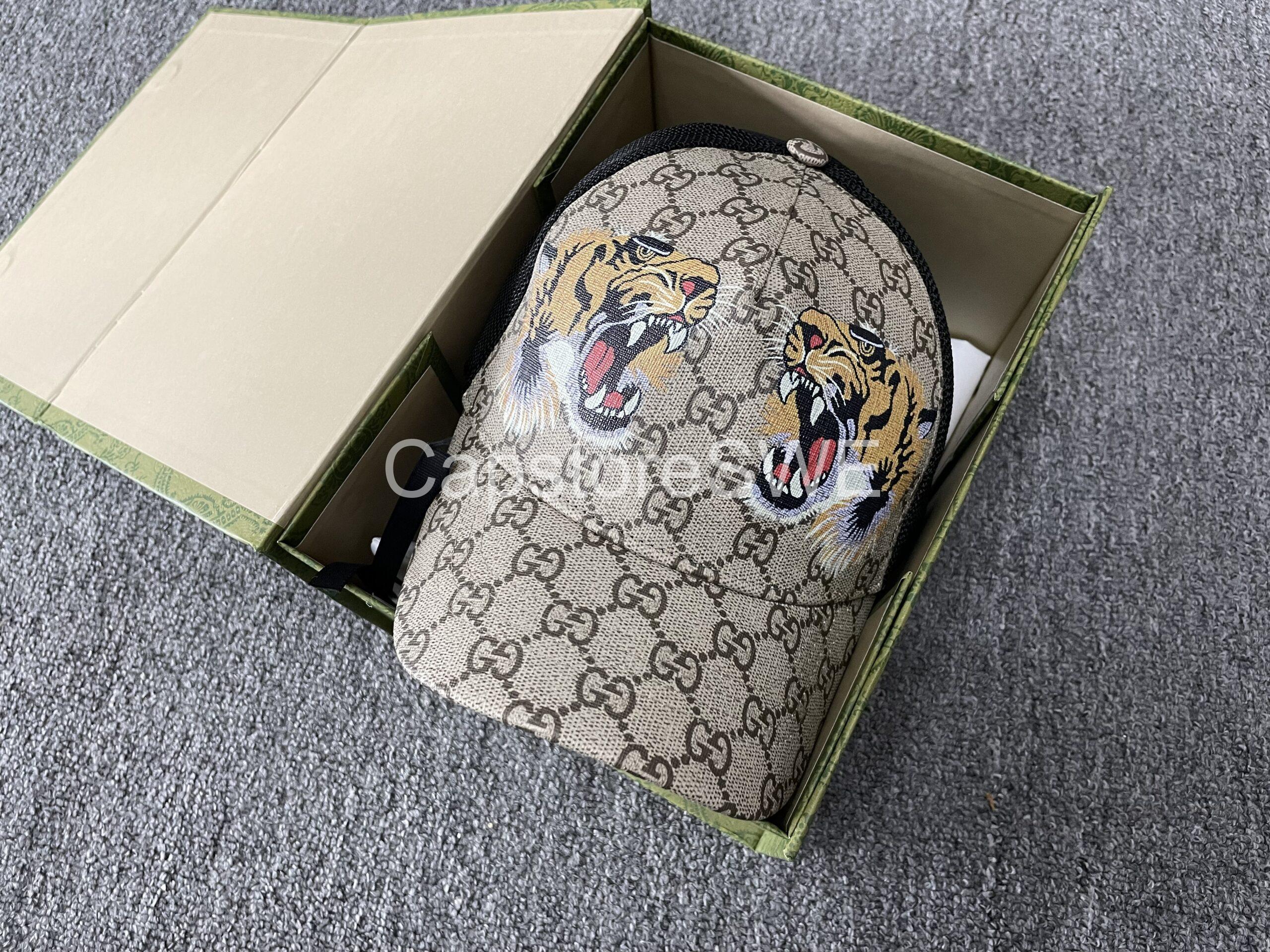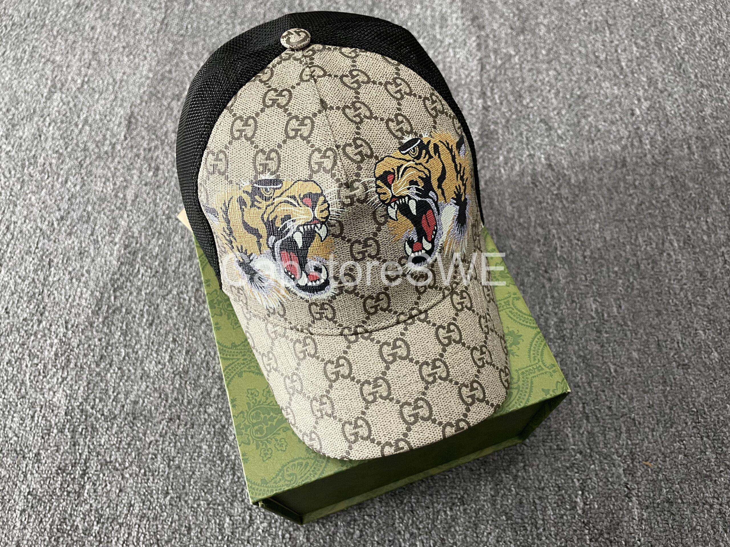 The Gucci Beige GG Supreme Cap with Tiger Print combines classic Gucci craftsmanship with bold design.