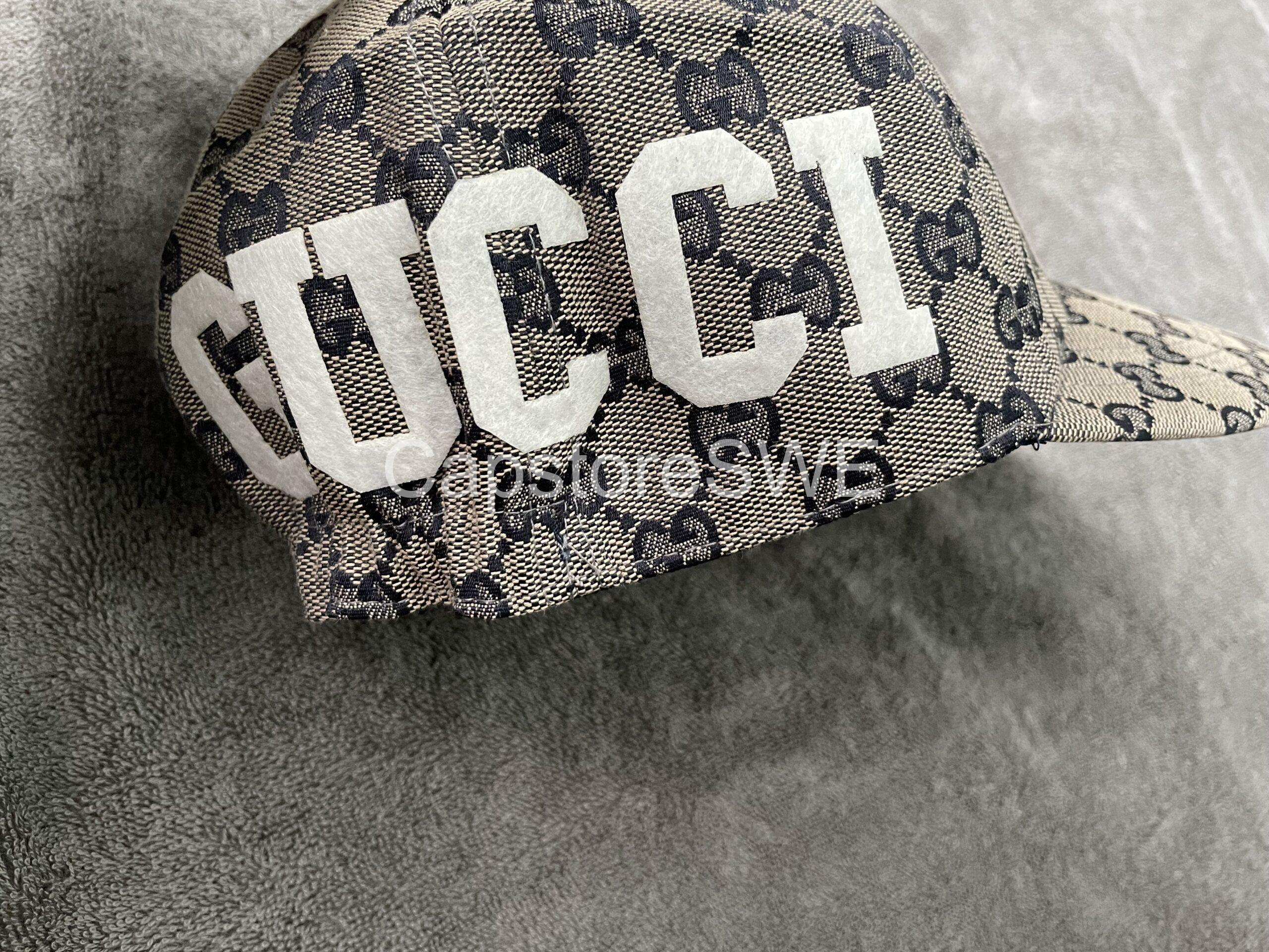 A stylish Gucci cap featuring the signature GG monogram canvas with bold embroidered lettering detail, perfect for elevating casual streetwear looks.
