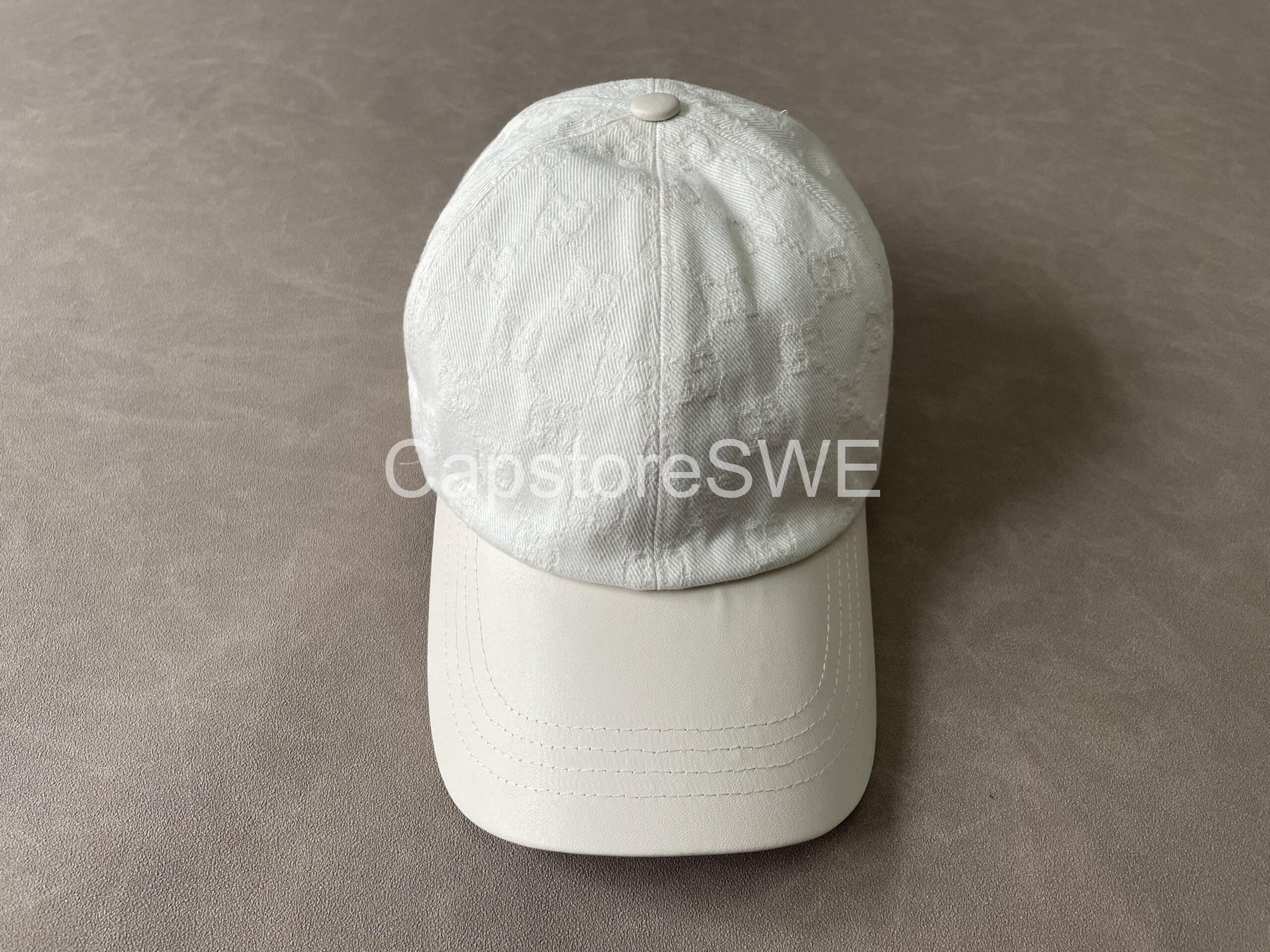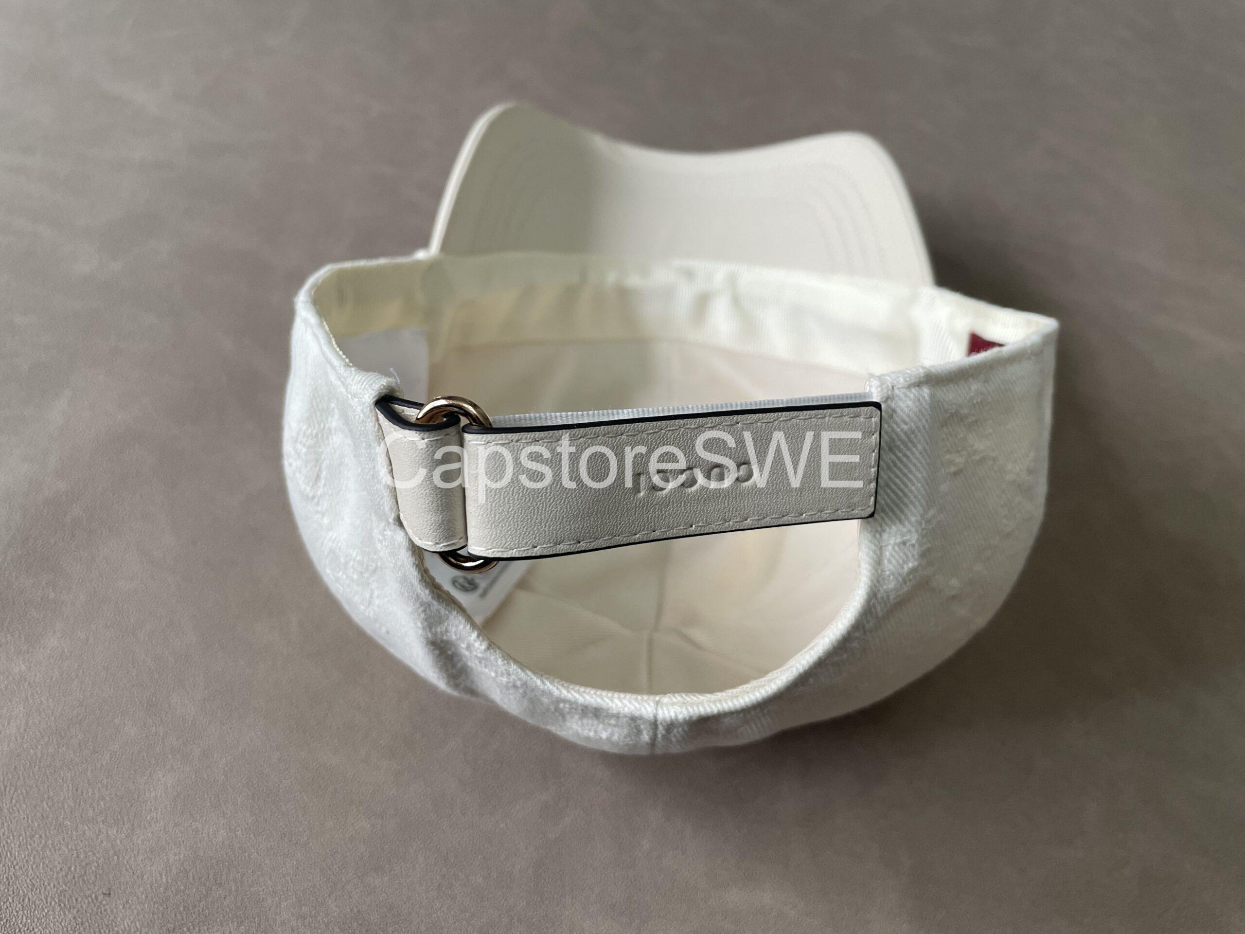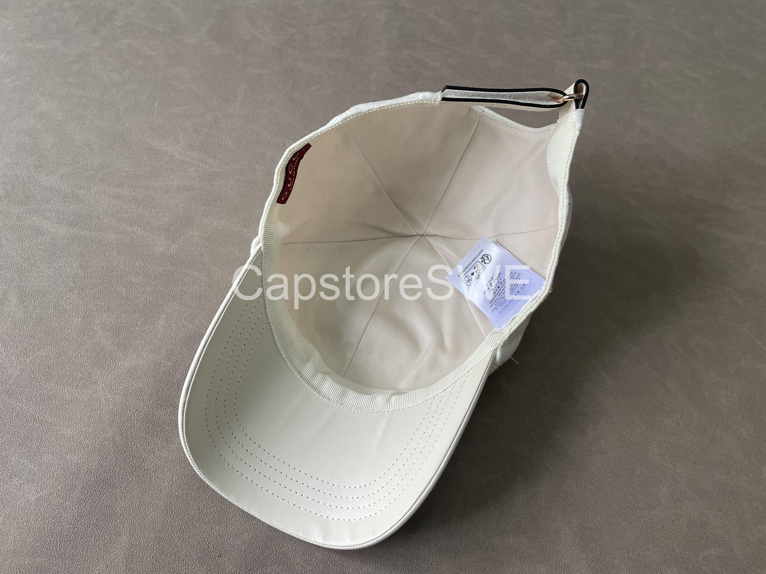The Gucci GG Monogram Cotton Canvas Cap brings timeless sophistication to casual wear. Designed in a fresh white shade, it features Gucci’s iconic all-over GG monogram pattern subtly embossed into the cotton canvas. A golden “G” detail on the side adds a touch of understated luxury. With its structured silhouette, curved brim, and adjustable back strap, this cap perfectly balances everyday comfort with high-fashion appeal.