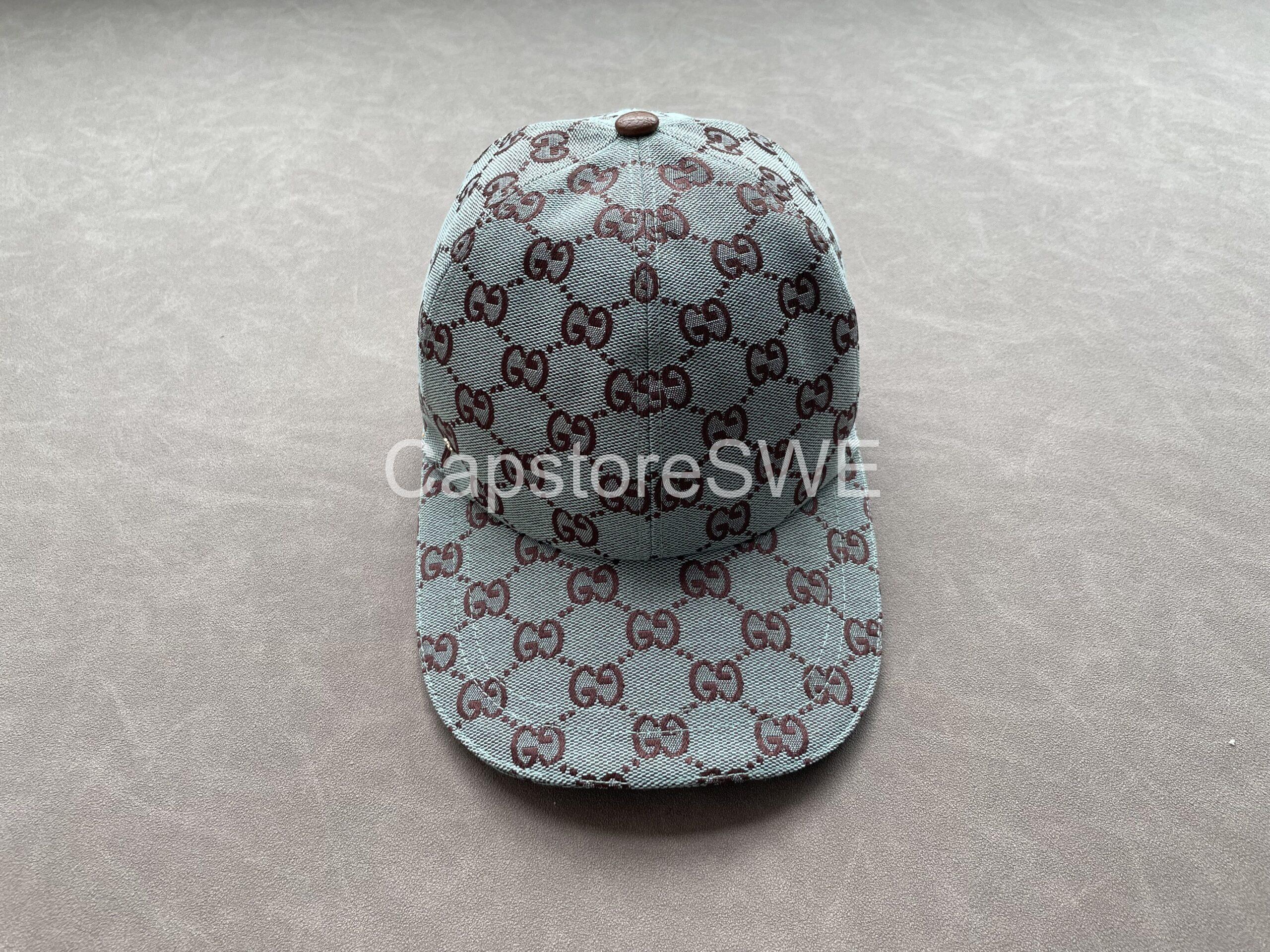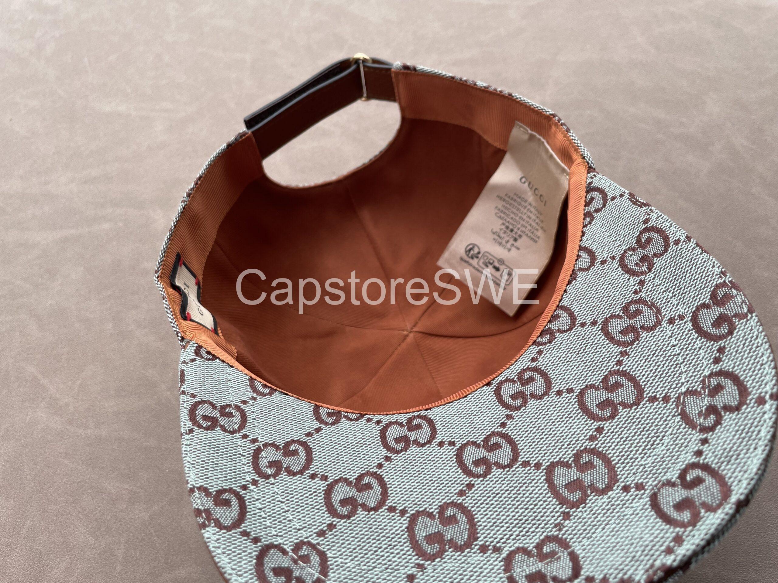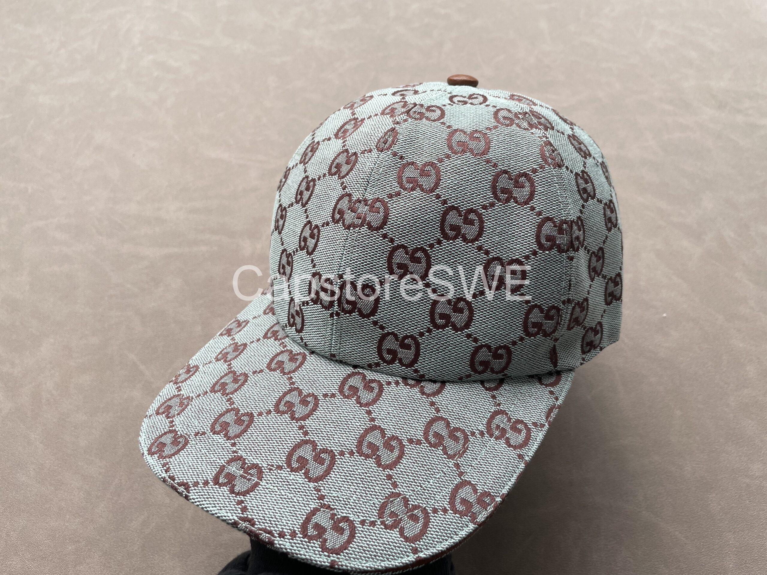 A classic Gucci cap featuring the iconic GG monogram in grey canvas with burgundy accents, combining timeless luxury with casual streetwear.
