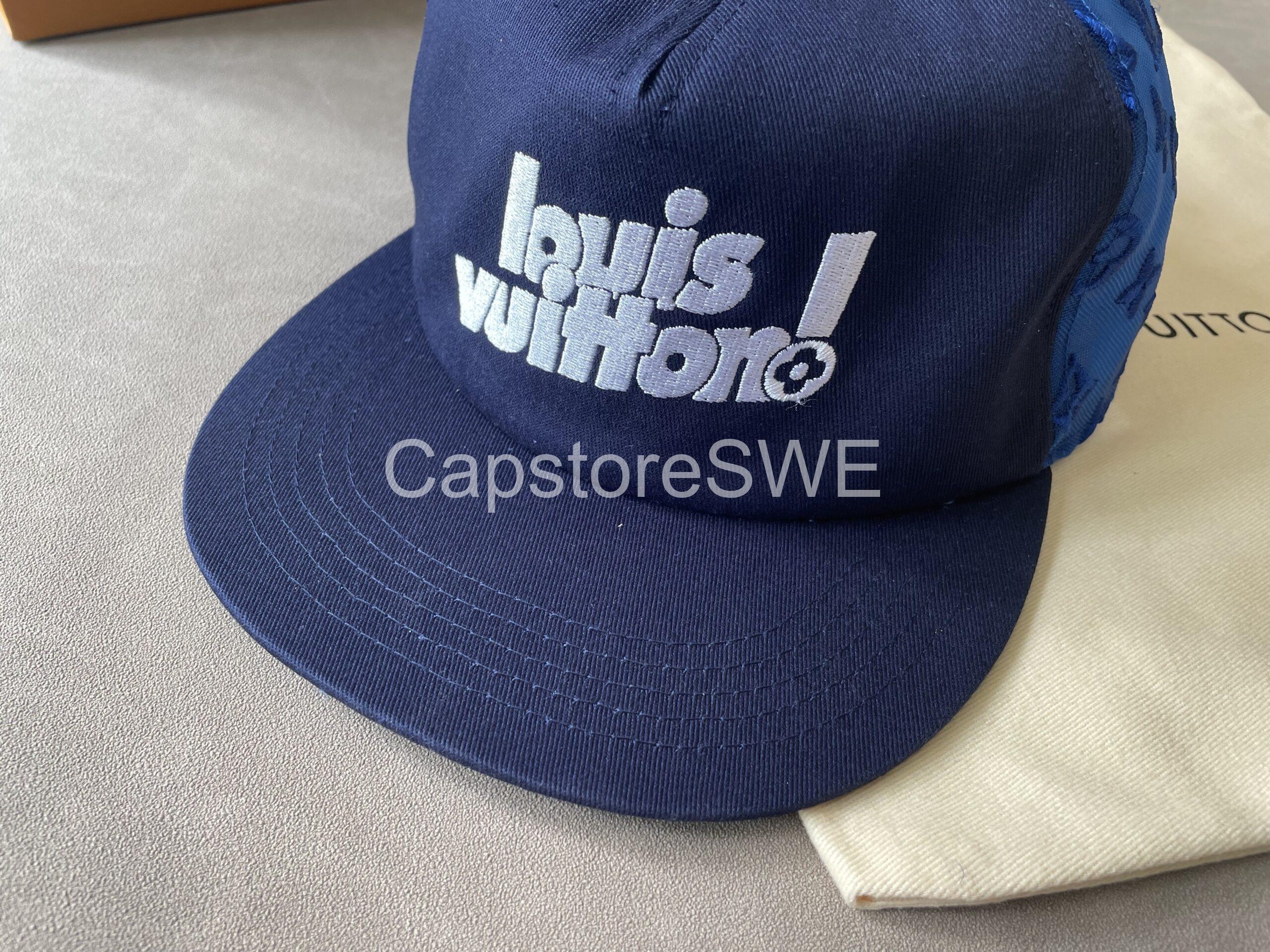 This Louis Vuitton Embroidered Logo Cap in navy blue is a luxury streetwear essential. The cap showcases a striking white embroidered “Louis Vuitton!” logo on the front, complemented by Monogram canvas panels in rich blue on the sides. Crafted from premium materials, it combines comfort and durability with iconic LV style. Perfect for elevating casual outfits, this piece is a versatile accessory for everyday wear.