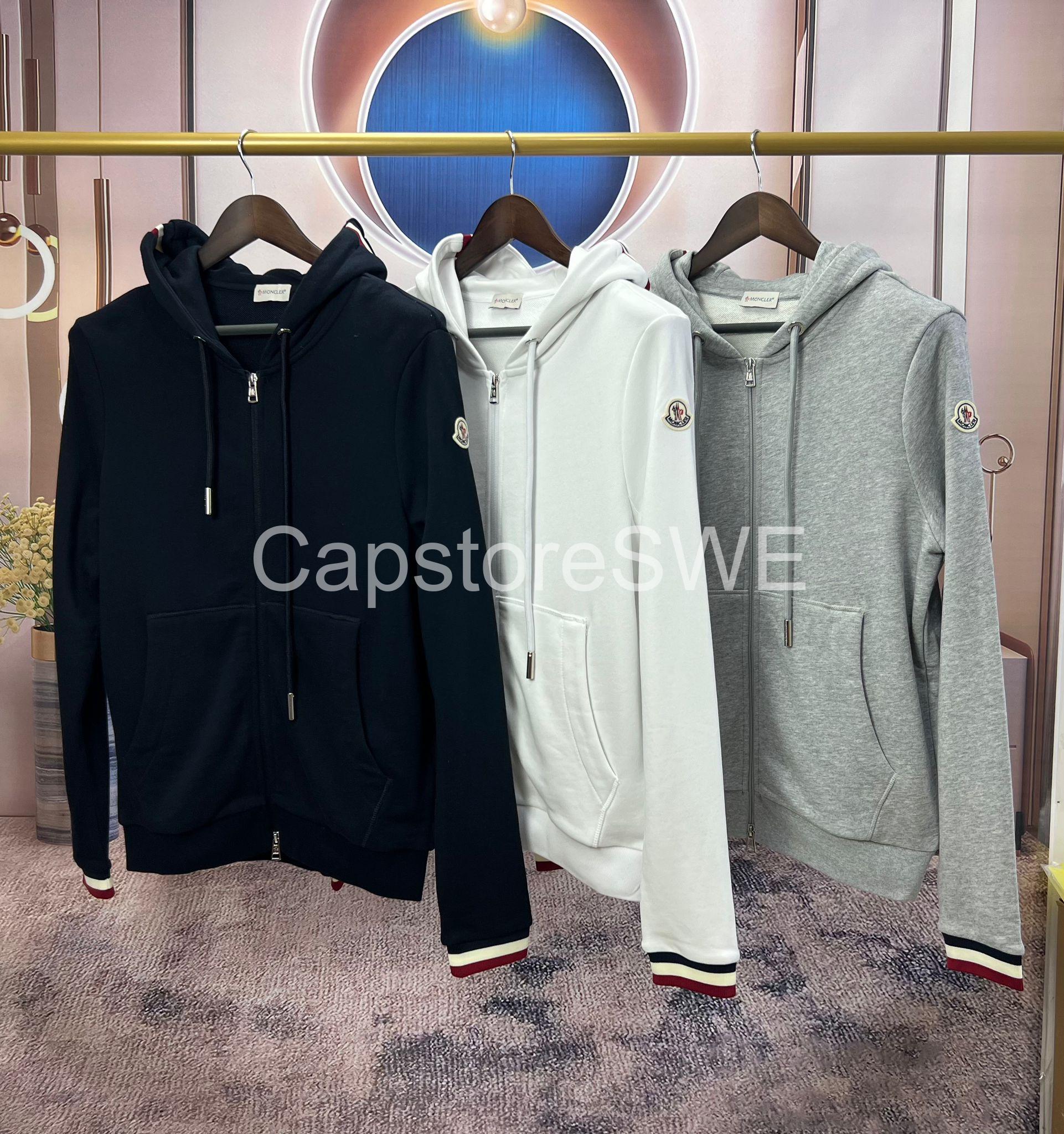 Each hoodie is accented with Moncler’s signature tricolor detailing along the cuffs and hem, paying homage to the brand’s French heritage. The embroidered Moncler logo patch on the upper sleeve completes the look with a touch of distinction.