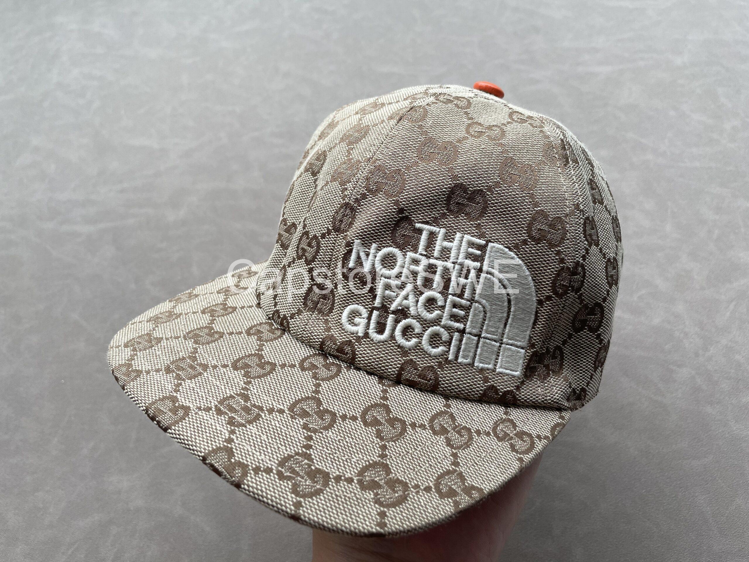 The North Face x Gucci Monogram Cap blends high-fashion with outdoor heritage. Crafted in durable beige canvas, it showcases Gucci’s iconic all-over GG monogram design. At the front, the bold embroidered The North Face x Gucci logo creates a striking focal point, symbolizing the unique collaboration between the luxury fashion house and the legendary outdoor brand. With a curved brim and adjustable back strap, this cap offers a perfect balance of comfort and statement-making style.